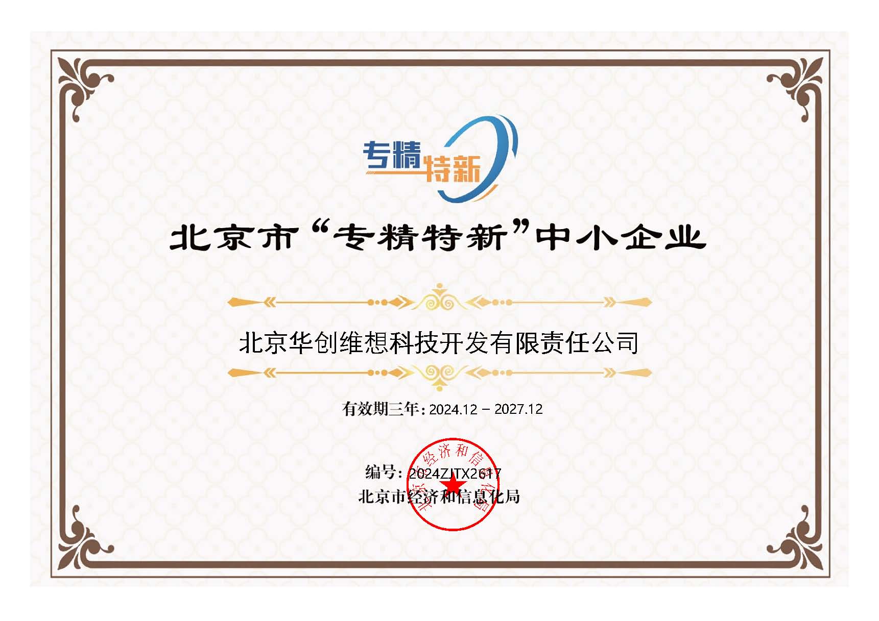 喜報—華創(chuàng)維想獲得北京市“專精特新”中小企業(yè)證書